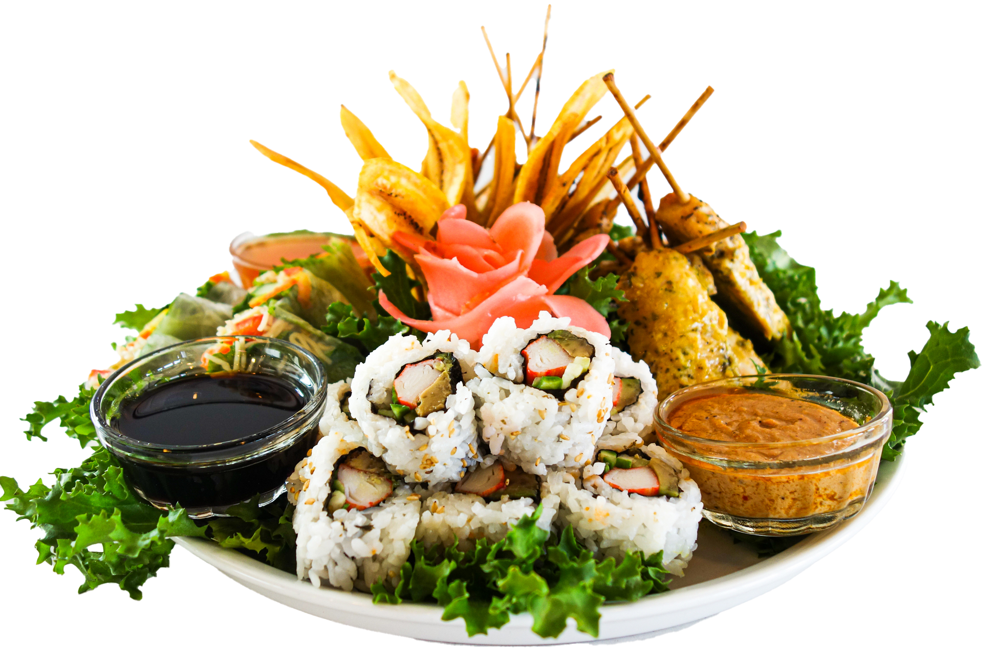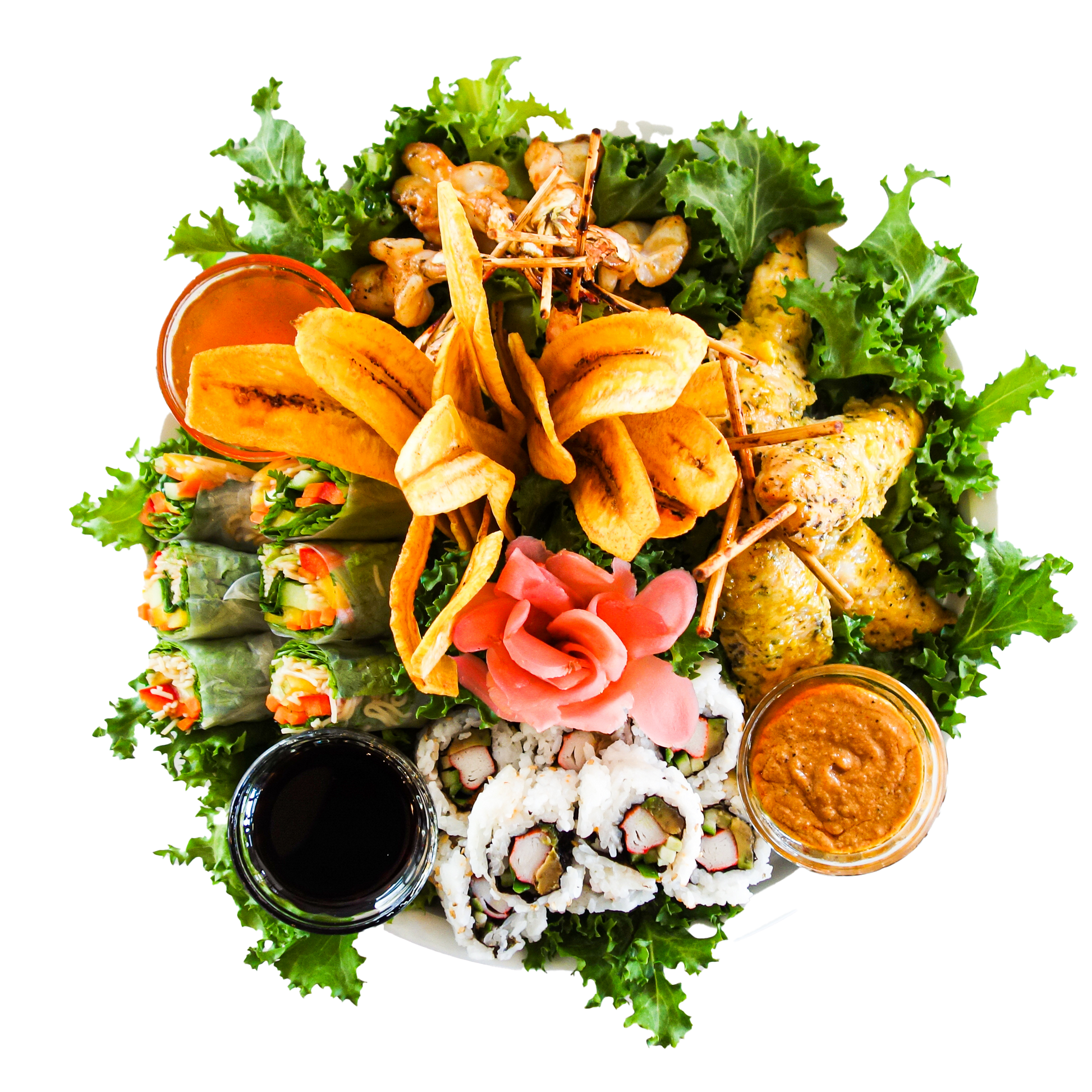 A selection of Thai salad rolls, chicken coconut skewers, szechuan shrimp skewers, vegetable rice rolls, and asian style dip, garnished with plantain chips.